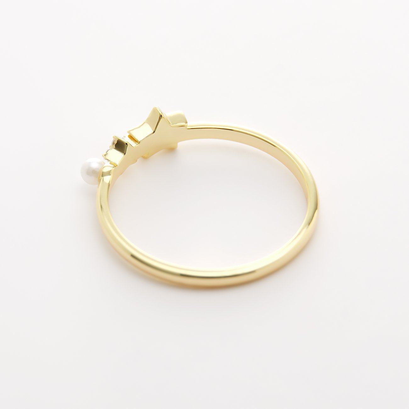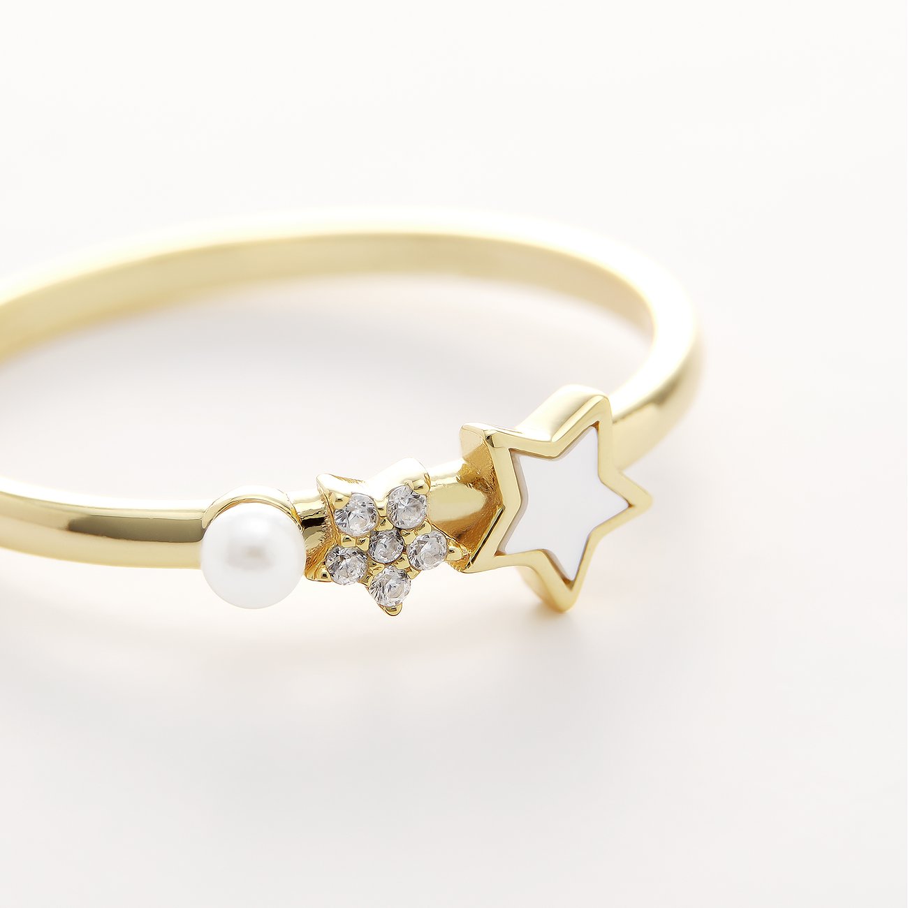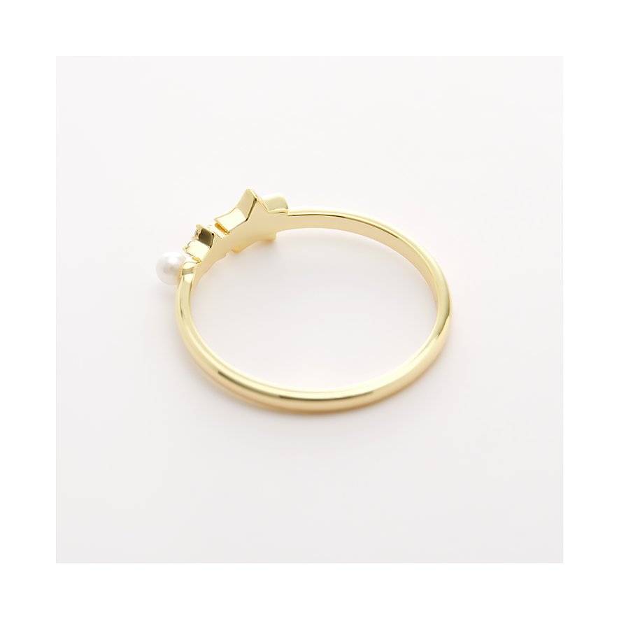 Das Highlight ist der obere Stern, dessen Fläche mit einem sanft schimmernden, weißen Perlmutt-Inlay gefüllt ist. Direkt darunter funkelt ein kleines Blüten- oder Sternenmotiv, besetzt mit fünf facettierten weißen Zirkonia-Steinen, die bei jeder Bewegung das Licht einfangen. Den Abschluss bildet eine makellose, runde Muschelkernperle in Weiß, die dem Design eine klassische und weiche Note verleiht. Die vertikale Anordnung der Elemente ist einzigartig und macht den Ring zu einem echten Blickfang.