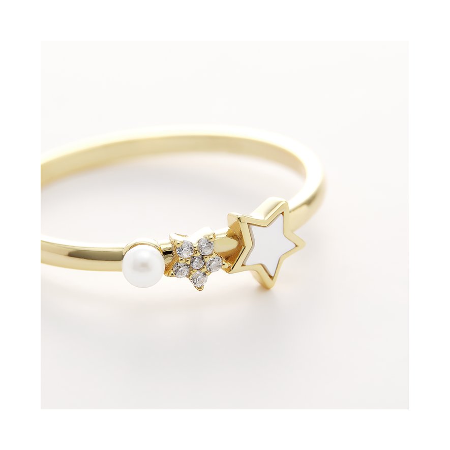 Entdecke diesen zauberhaften Ring für Frauen von CHRIST, der die Magie des Nachthimmels an deinen Finger bringt. Gefertigt aus recyceltem 925er Silber und mit einer warmen Vergoldung veredelt, strahlt dieses Schmuckstück in einem eleganten, warmen Farbton. Das Design ist eine liebevolle Komposition himmlischer Symbole: An der schmalen, polierten Ringschiene reihen sich ein strahlender Stern, ein funkelndes Sternenbild und eine zarte Perle aneinander.