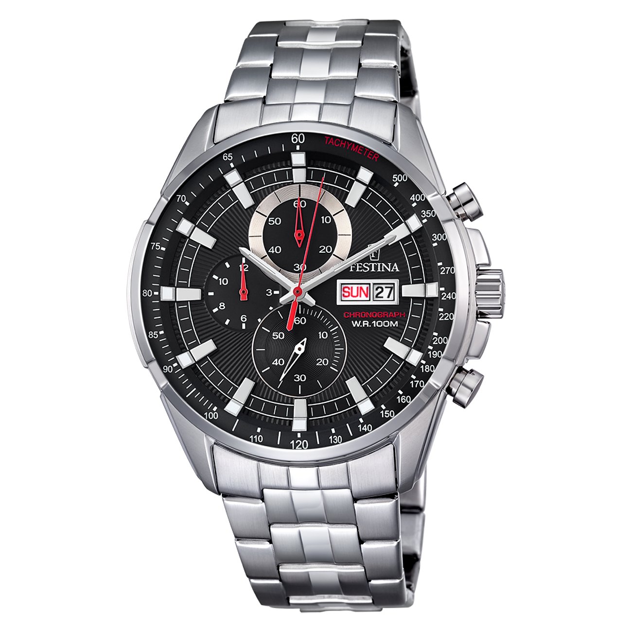 Eine moderne Uhr für stilbewusste Männer? Liefert uns Festina mit dem silberfarbigen Chronographen. Hochwertiger Edelstahl vereint sich hier mit Mineralglas und fügt sich zu einem exklusiven Langzeit-Begleiter zusammen. Extras wie Datum- und Wochentaganzeige oder Leuchtindizes und Stoppfunktion runden die Herren-Uhr smart ab. Unsere Redaktion findet: Sie passt sowohl zu sportiv interpretierten Outfits als auch zu Casual-Looks. Fazit: Armbanduhren wie diese Kreation sind eine Bereicherung für jeden Tag.
