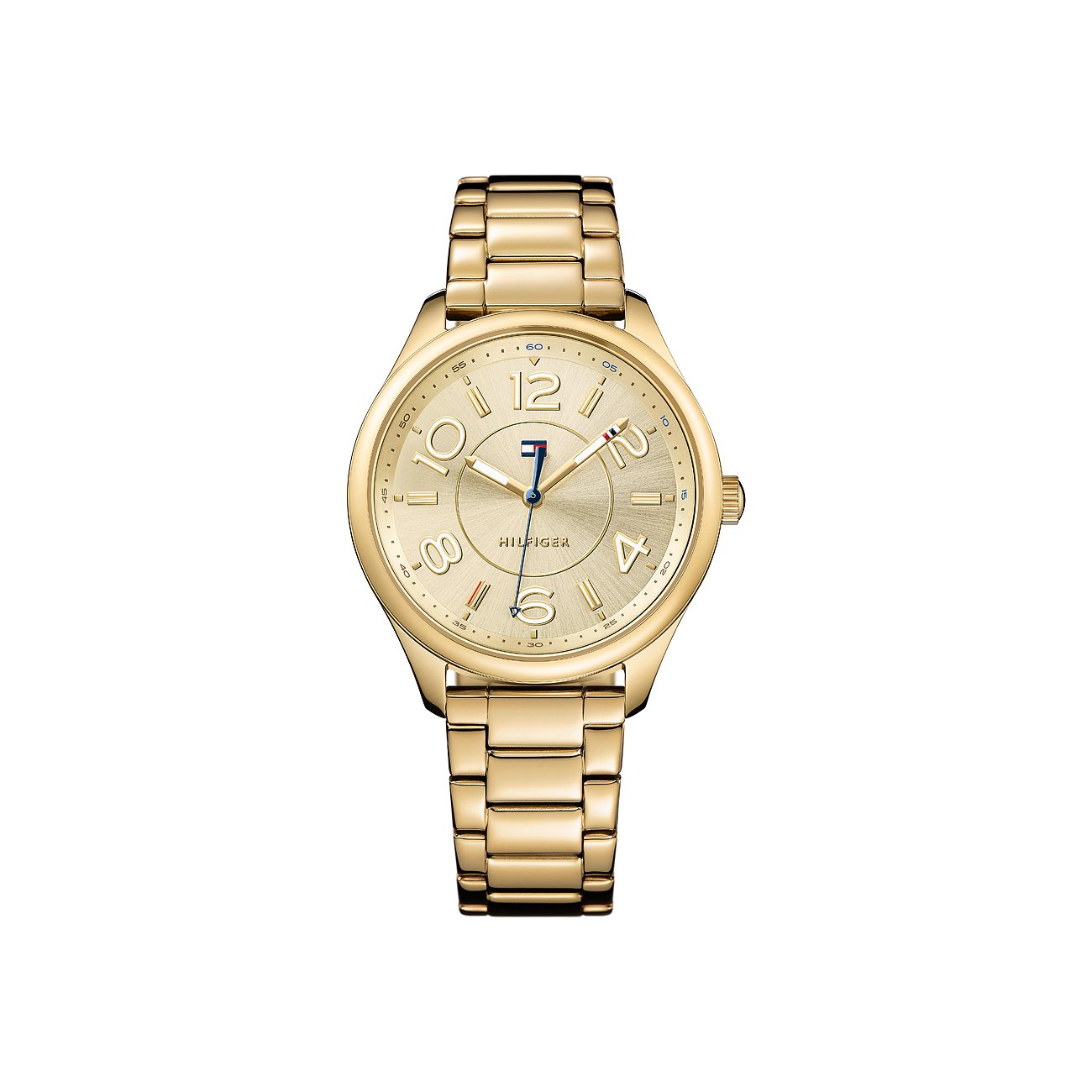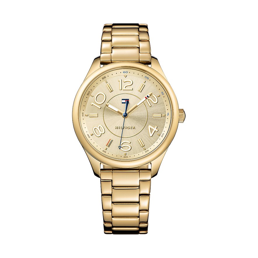 Elegante Damenuhr aus Edelstahl und Mineralglas, mit Datums- und Wochentagsanzeige. Wasserdicht bis 3 Bar.