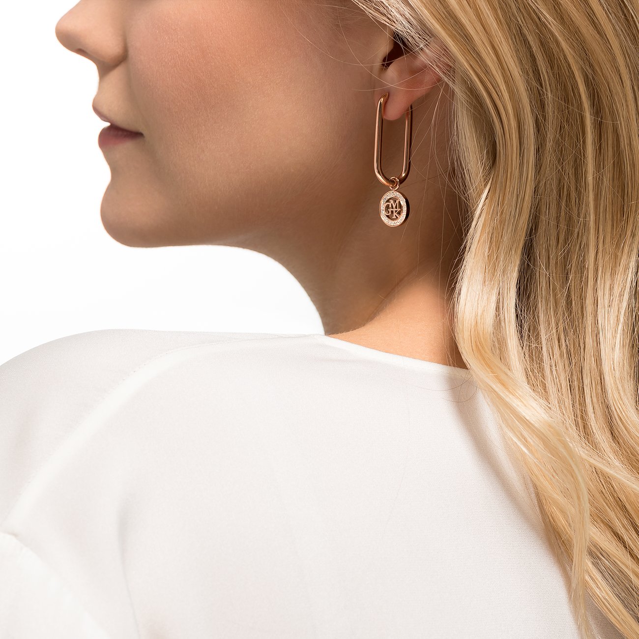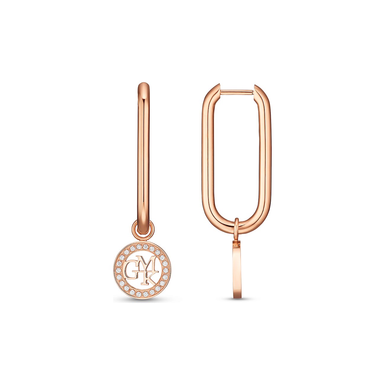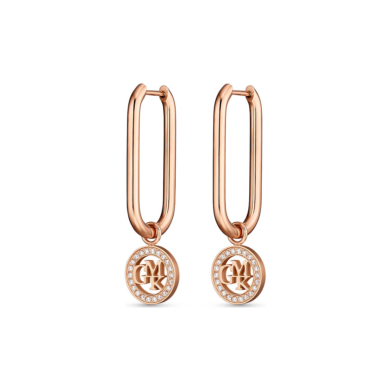 Mit ihrer länglichen Form wirken die Creolen originell und charmant. Der Ohrschmuck aus wahlweise silbern, roségolden oder golden poliertem Edelstahl bezaubert mit seinem sanften Schwingen und den schönen, runden Anhängern. Im Außenkreis befinden sich weiße Zirkonia-Steine. In der offenen Mitte setzt GMK sein Markenzeichen als stilvolles Statement. Mit dem Klappring-Verschluss lassen sich die attraktiven Ohrhänger leicht fixieren.