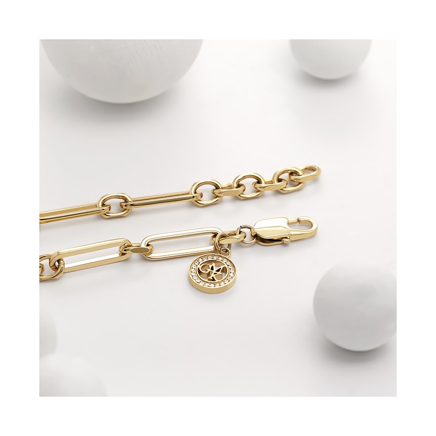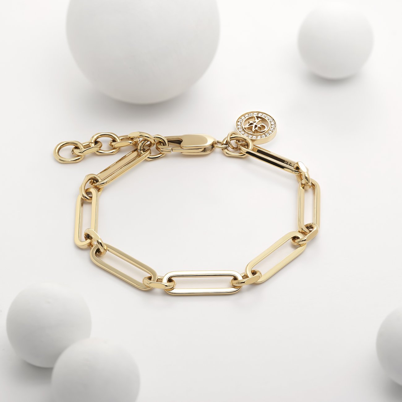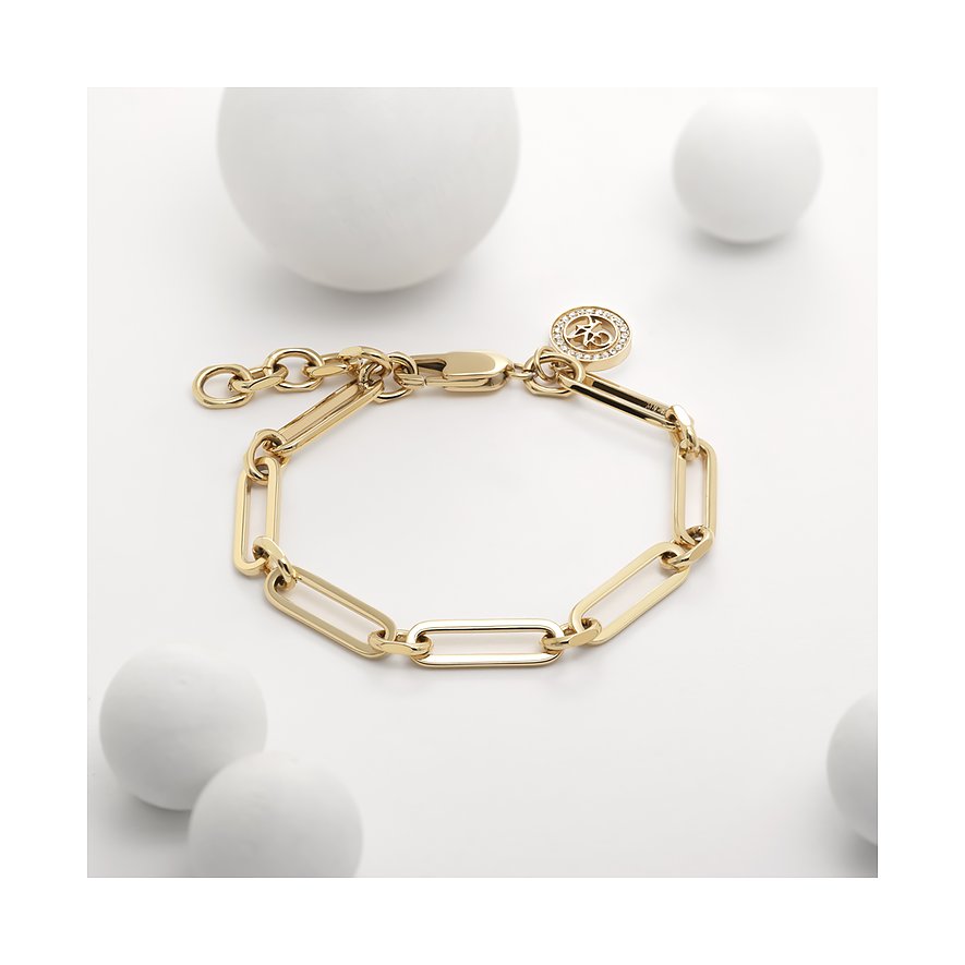 Ankerkette meets Paperlink: In diesem goldfarbenen Armband bringt Guido Maria Kretschmer 2 beliebte Kettenarten zusammen. Je ein länglich gestaltetes und ein ovales Glied aus vergoldetem Edelstahl wechseln sich ab. Ein liebevolles Detail ist der Markenanhänger am verlängerbaren Karabinerverschluss. Er ist mit einem dezenten Logo und 23 weißen Zirkonia verziert. Solo oder in Kombi mit weiterem Armschmuck – dieses Accessoire legt immer einen glänzenden Auftritt hin!