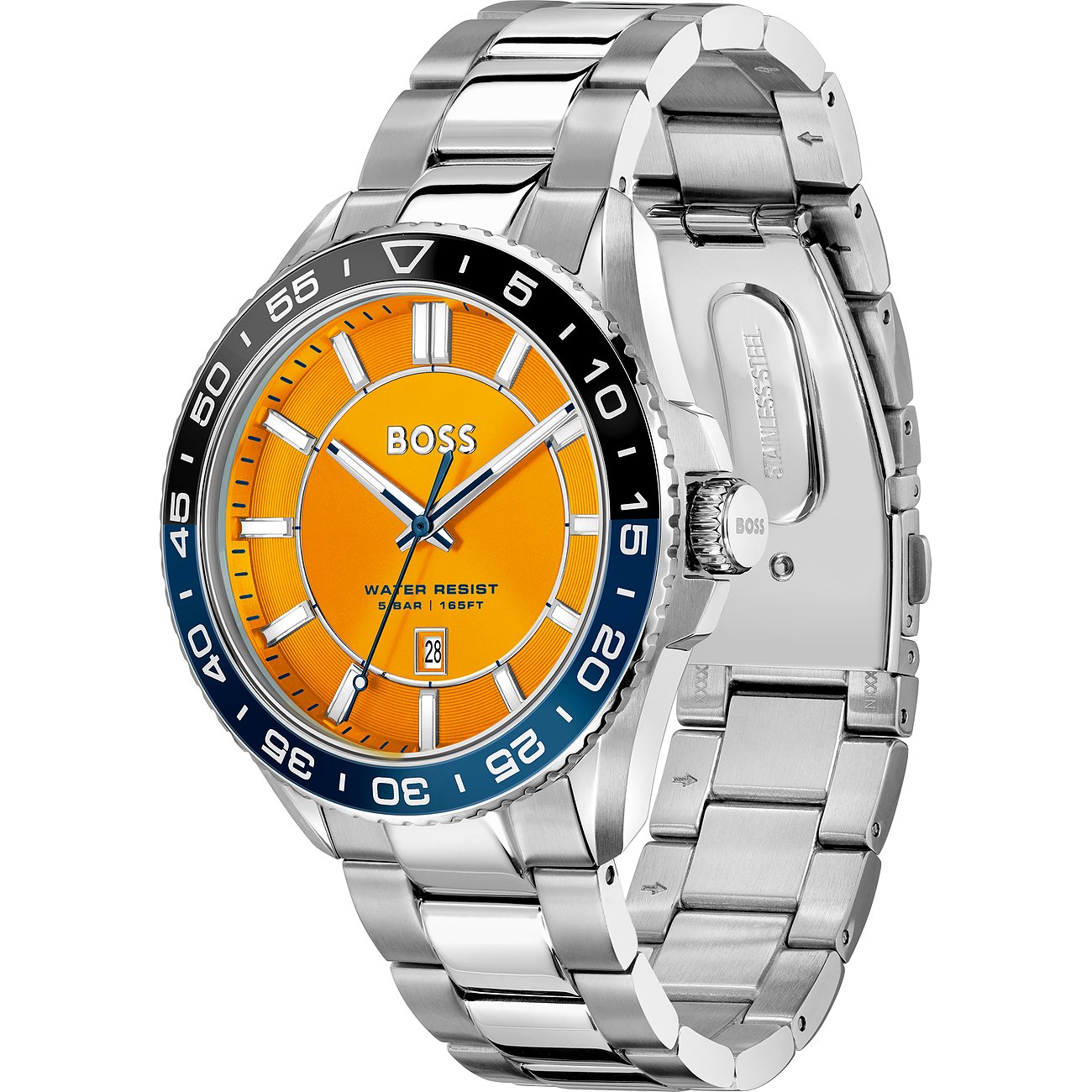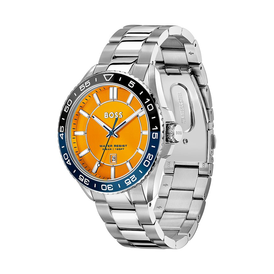 Mit ihrer Uhrenkollektion hat die Marke Boss ihr reiches Erbe mit einer tief verwurzelten Tradition in der Welt der Mode, und ihre Expertise in einer weiteren Sparte manifestiert. Diese Uhren vereinen zeitgenössisches Design mit der bewährten Zuverlässigkeit der Marke, symbolisieren Eleganz und unterstreichen die Bedeutung von Tradition in der modernen Zeitmessung. Sie sind Ausdruck von Stilbewusstsein und einem zeitlosen Verständnis für Qualität. Eine perfekte Kombination aus lässig und elegant – das ist diese Herrenuhr. Sie wird besonders durch das Edelstahl-Gehäuse und das unkomplizierte Armband aus Edelstahl geprägt. Das Gehäuse und das Armband der Boss Runner 3H sind in Silber gehalten, sie werden durch eine zweifarbige Lünette und ein oranges Ziffernblatt perfekt abgerundet.