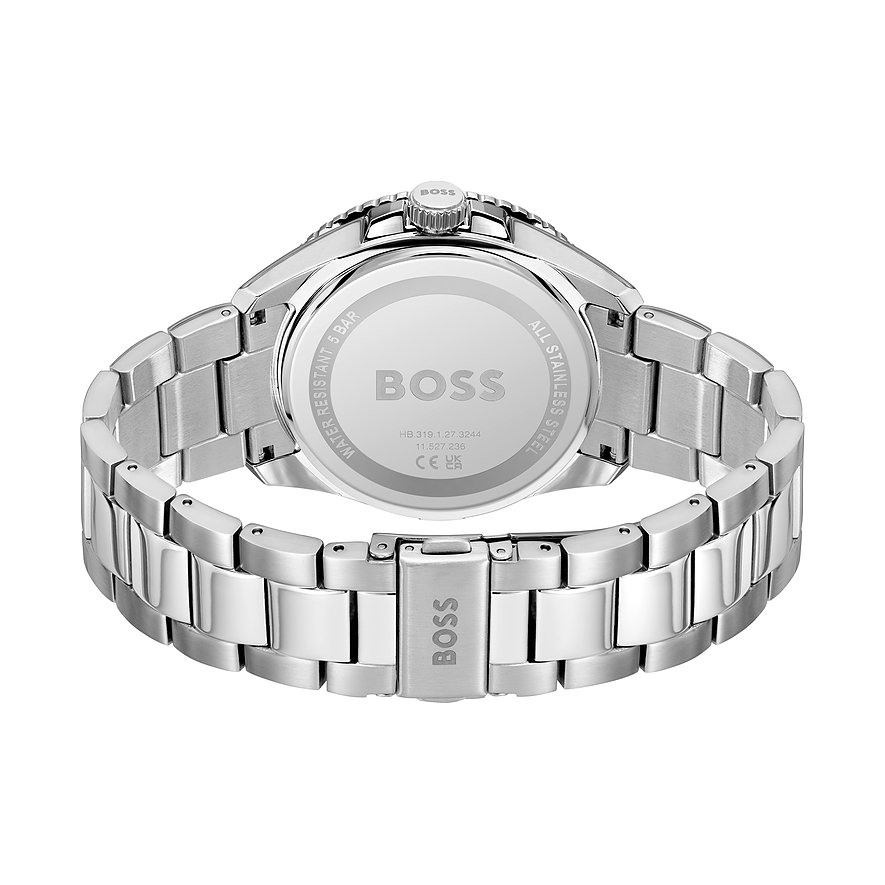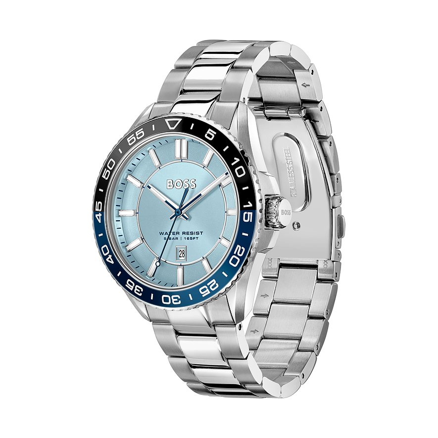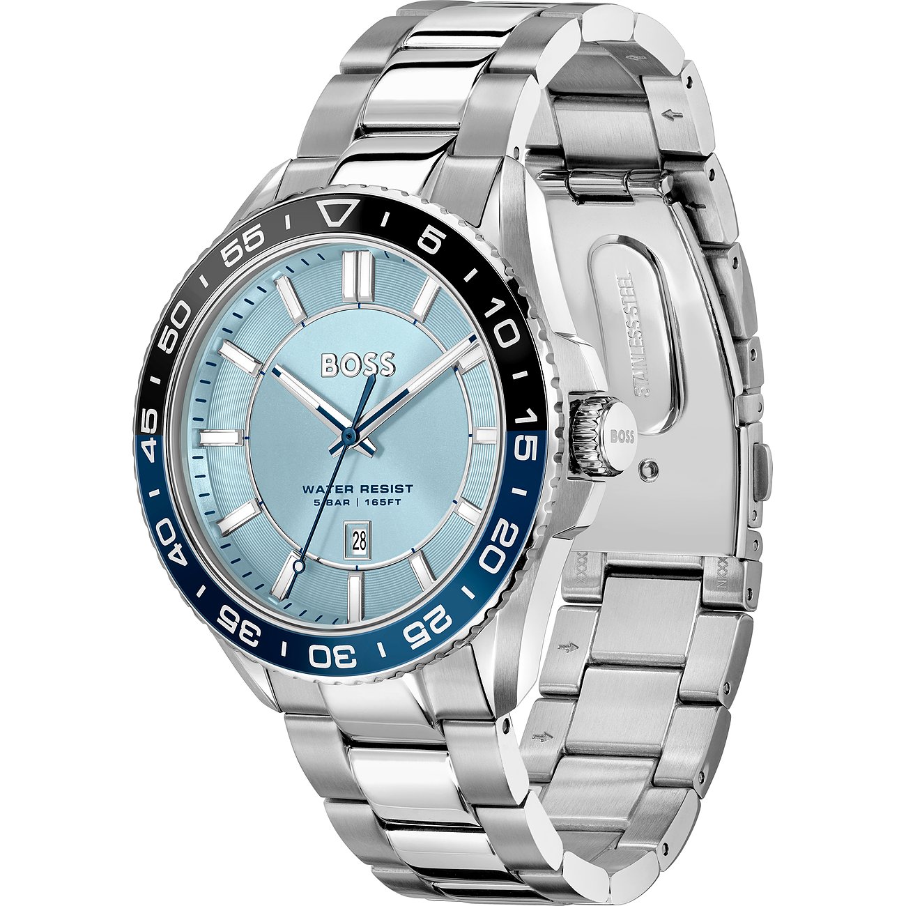 Mit ihrer Uhrenkollektion hat die Marke Boss ihr reiches Erbe mit einer tief verwurzelten Tradition in der Welt der Mode, und ihre Expertise in einer weiteren Sparte manifestiert. Diese Uhren vereinen zeitgenössisches Design mit der bewährten Zuverlässigkeit der Marke, symbolisieren Eleganz und unterstreichen die Bedeutung von Tradition in der modernen Zeitmessung. Sie sind Ausdruck von Stilbewusstsein und einem zeitlosen Verständnis für Qualität. Eine perfekte Kombination aus lässig und elegant – das ist diese Herrenuhr. Sie wird besonders durch das Edelstahl-Gehäuse und das unkomplizierte Armband aus Edelstahl geprägt. Das Gehäuse und das Armband der Boss Runner 3H sind in Silber gehalten, sie werden durch eine zweifarbige Lünette und ein blaues Ziffernblatt perfekt abgerundet.