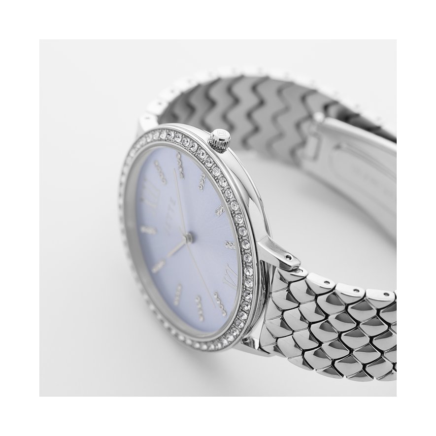 Für etwas mehr Glamour sorgen strahlende Kristall-Steine. Ein echter Allrounder ist das runde Gehäuse mit 40 Millimetern Durchmesser: Es sieht einfach an jedem Handgelenk gut aus. Im Inneren tickt ein zuverlässiges Time Modul-Quarzwerk.