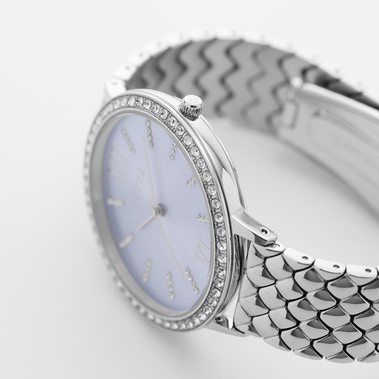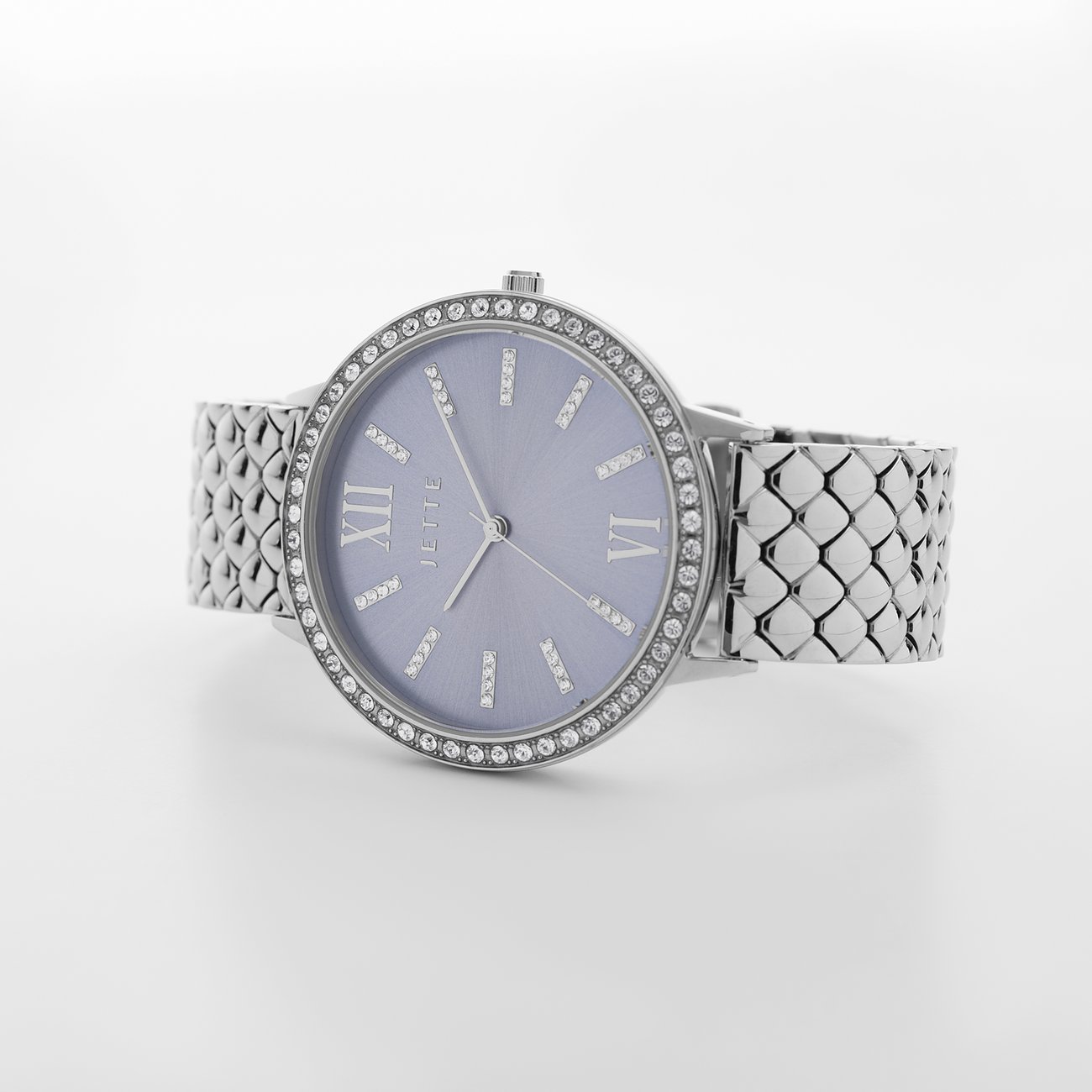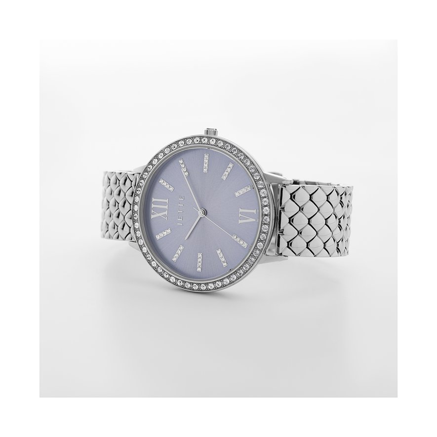 Diese Damenuhr mit Edelstahl-Gehäuse an einem klassischen Edelstahl-Armband ist dank des sportlich-eleganten Designs der perfekte Begleiter für jeden Anlass. Das hellblaue Ziffernblatt der JETTE Snake setzt optisch einen besonderen Akzent, während das Gehäuse, das Armband und die Lünette einheitlich in Silber gehalten sind.