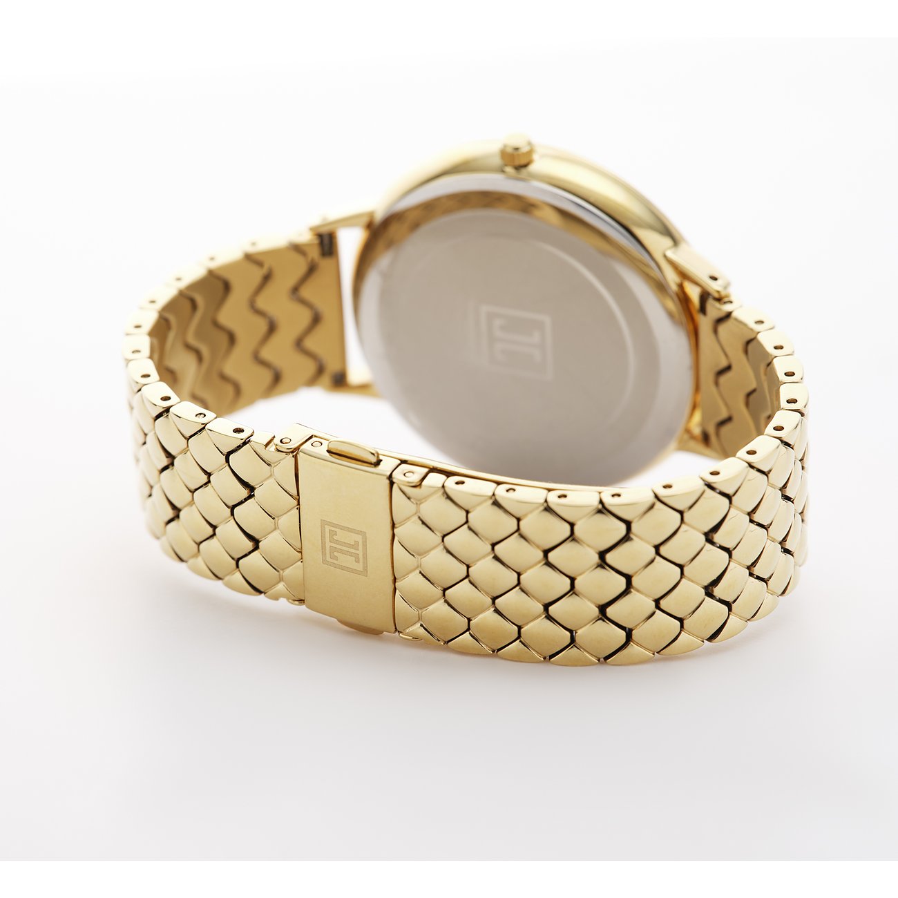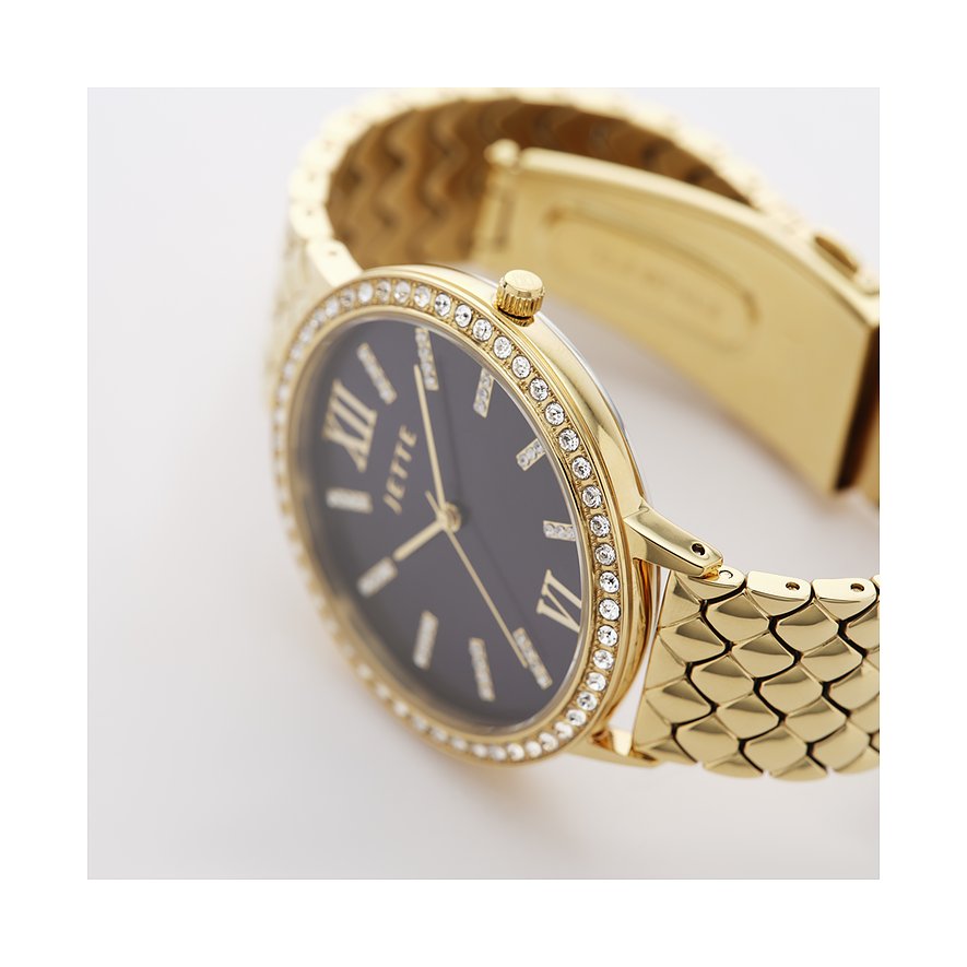 Ein sportlich-eleganter Klassiker ist diese Damenuhr mit Edelstahl-Gehäuse an einem unkomplizierten Edelstahl-Band. Das dunkelblaue Ziffernblatt der JETTE Snake setzt einen besonderen Akzent zu den ansonsten einheitlich in Gelbgold gehaltenen Gehäuse, Armband und Lünette.
