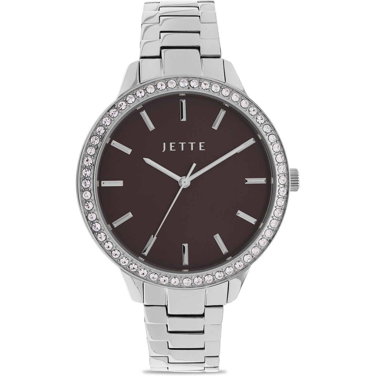 Eine perfekte Kombination aus lässig und elegant - das ist diese Damenuhr. Sie wird besonders durch das Edelstahl-Gehäuse und das robuste, aber dennoch schicke Band aus Edelstahl geprägt. Das dunkelbraune Ziffernblatt der JETTE Fancy setzt optisch einen besonderen Akzent, während das Gehäuse, das Armband und die Lünette einheitlich in Silber gehalten sind.