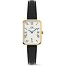 Ein stilvoller Klassiker ist diese Damenuhr mit Edelstahl-Gehäuse an einem bequemen sowie schicken Leder-Band. Die Daniel Wellington Quadro hat ein gelbgoldenes Gehäuse, ein Armband in Schwarz und ein weißes Ziffernblatt.