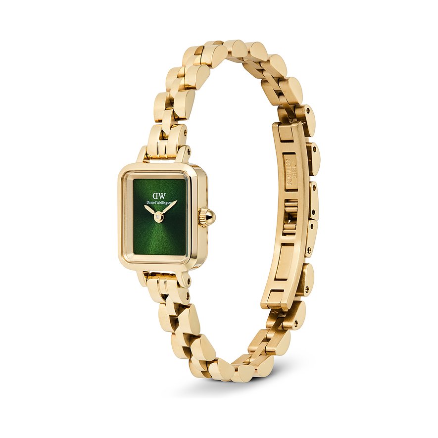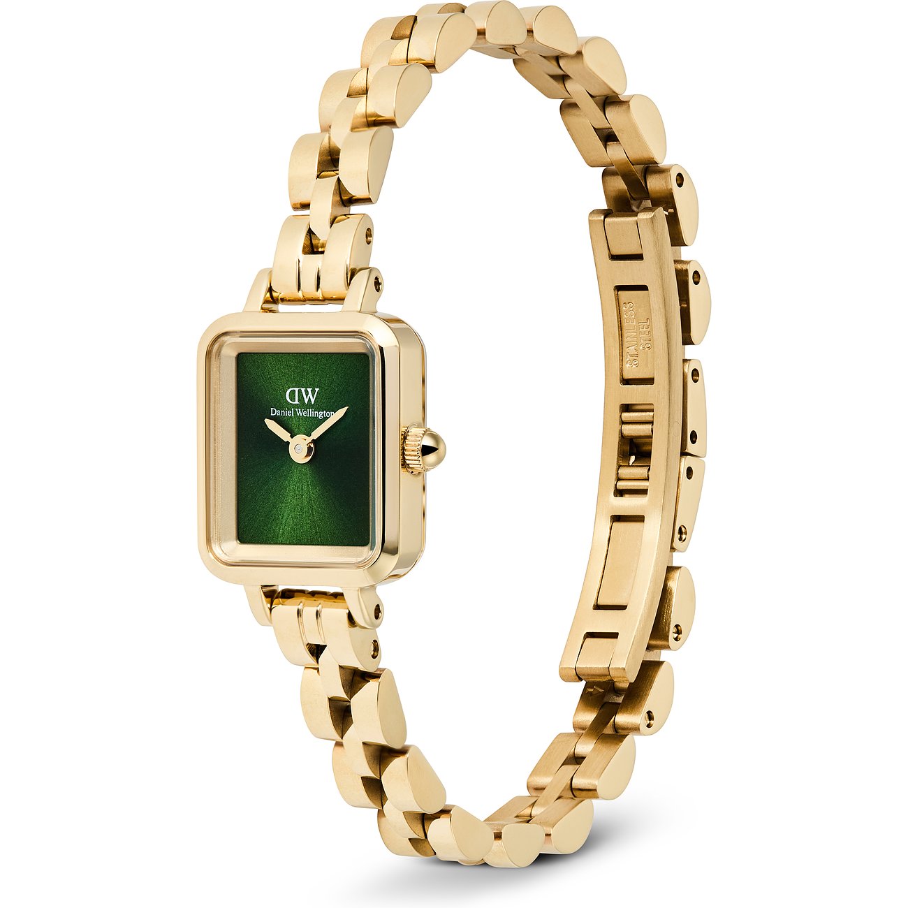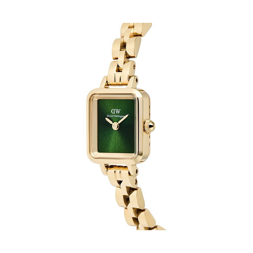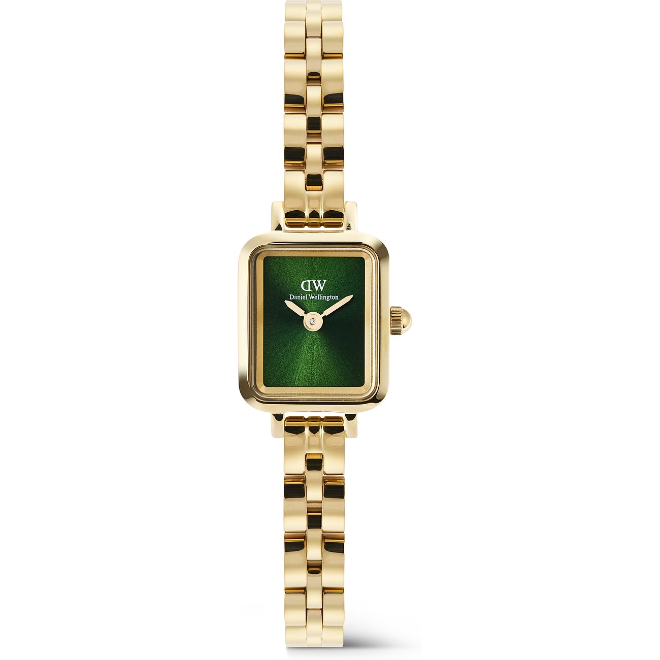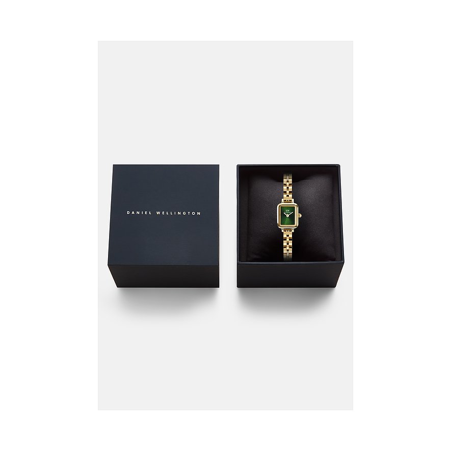 Diese Damenuhr mit Edelstahl-Gehäuse an einem klassischen Metall-Armband ist dank des sportlich-eleganten Designs der perfekte Begleiter für jeden Anlass. Gehäuse und Armband der Daniel Wellington Quadro Mini sind in Gelbgold gehalten. Das grüne Ziffernblatt ist eine harmonische Ergänzung.