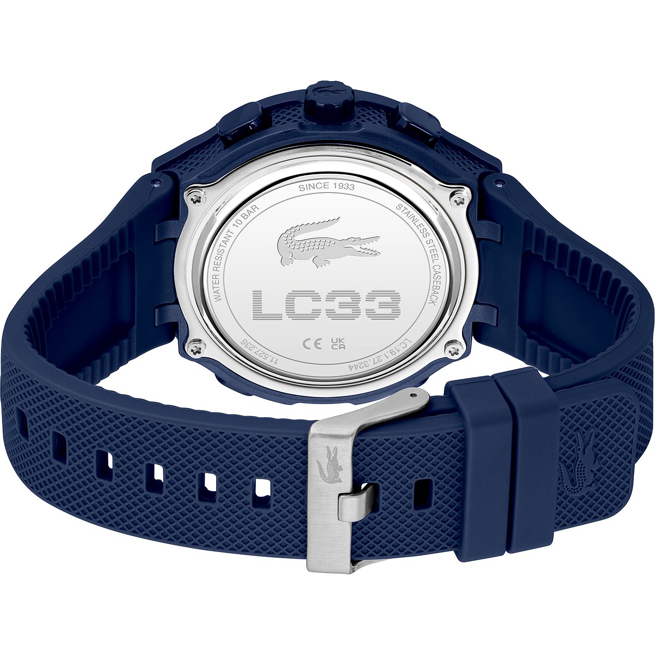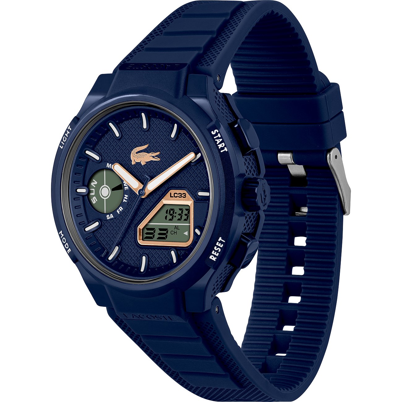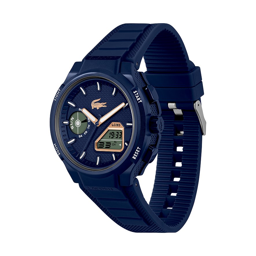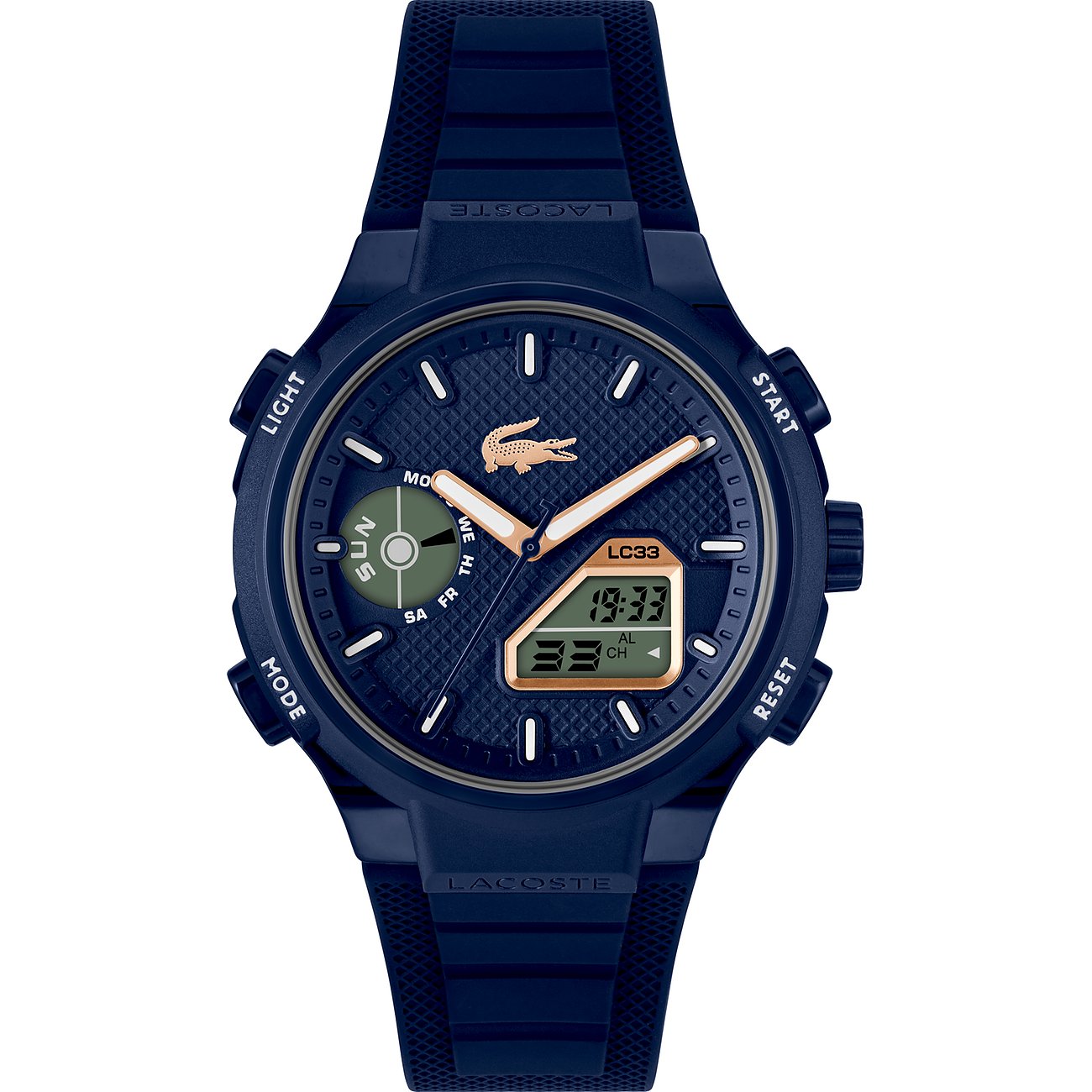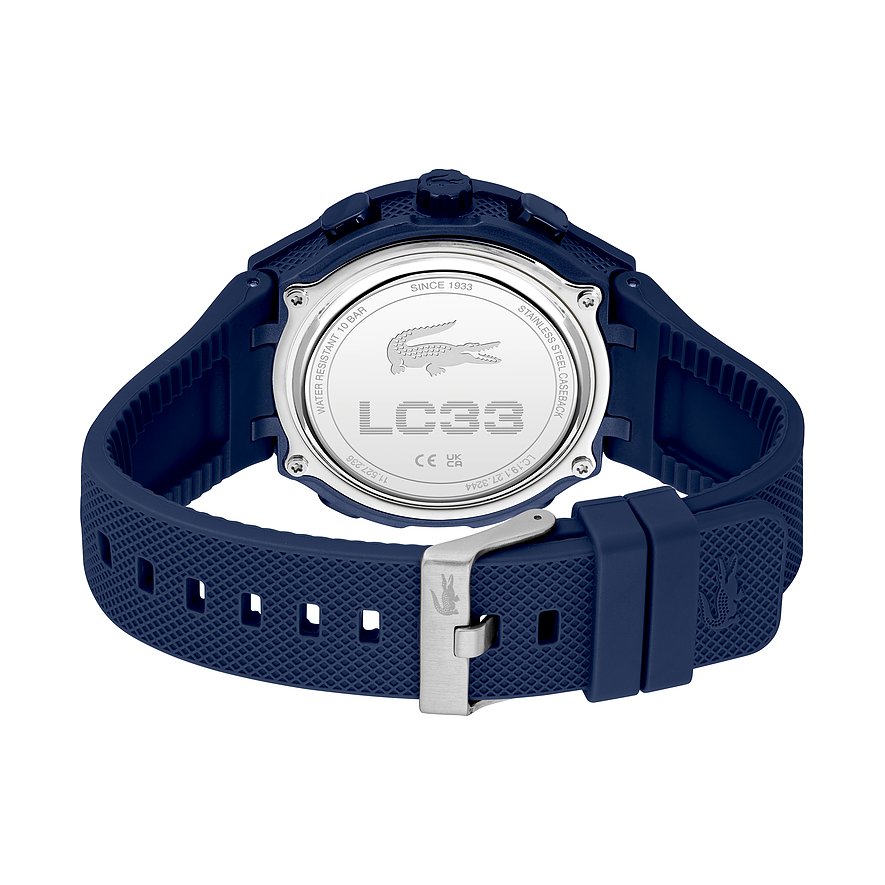 Lacoste Uhren sind das Symbol für sportlichen Luxus und unkomplizierte Eleganz. Diese Zeitmesser bringen das Beste aus beiden Welten zusammen - sie sind vielseitig, stilvoll und unterstreichen deinen Look mit einem Hauch von französischem Flair. Für Herren, die in Sachen Stil und Qualität keine Abstriche machen möchten, ist die LacosteLc33 die optimale Wahl. Dieser sportive Chronograph kombiniert ein robustes Gehäuse aus Edelstahl mit Kunststoff und ein sportliches Silikonband. Ton in Ton: Vom Gehäuse über das Armband bis zum Ziffernblatt und zur Lünette - die Farbgebung komplett in Dunkelblau macht die Lacoste Lc33 zum echten Hingucker.