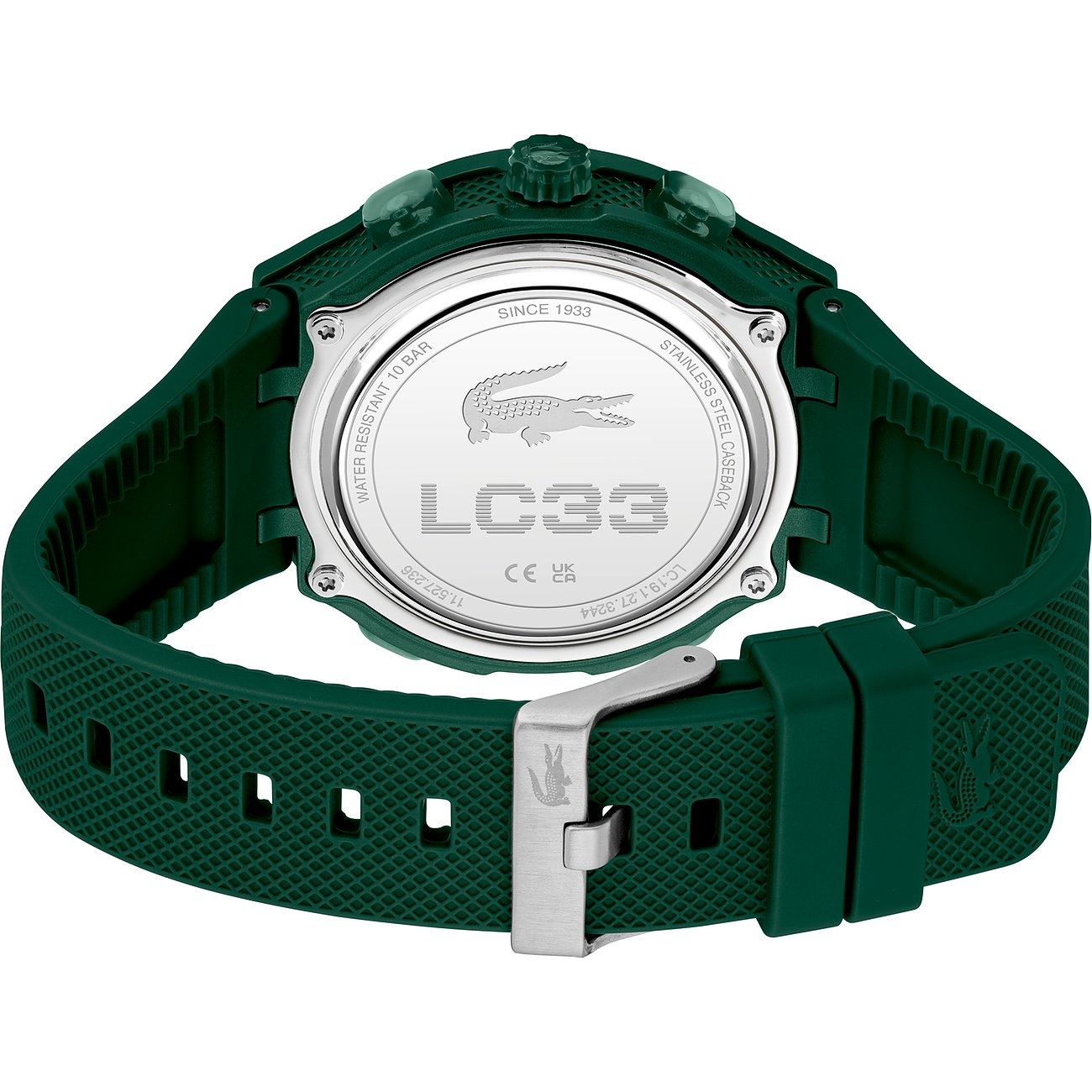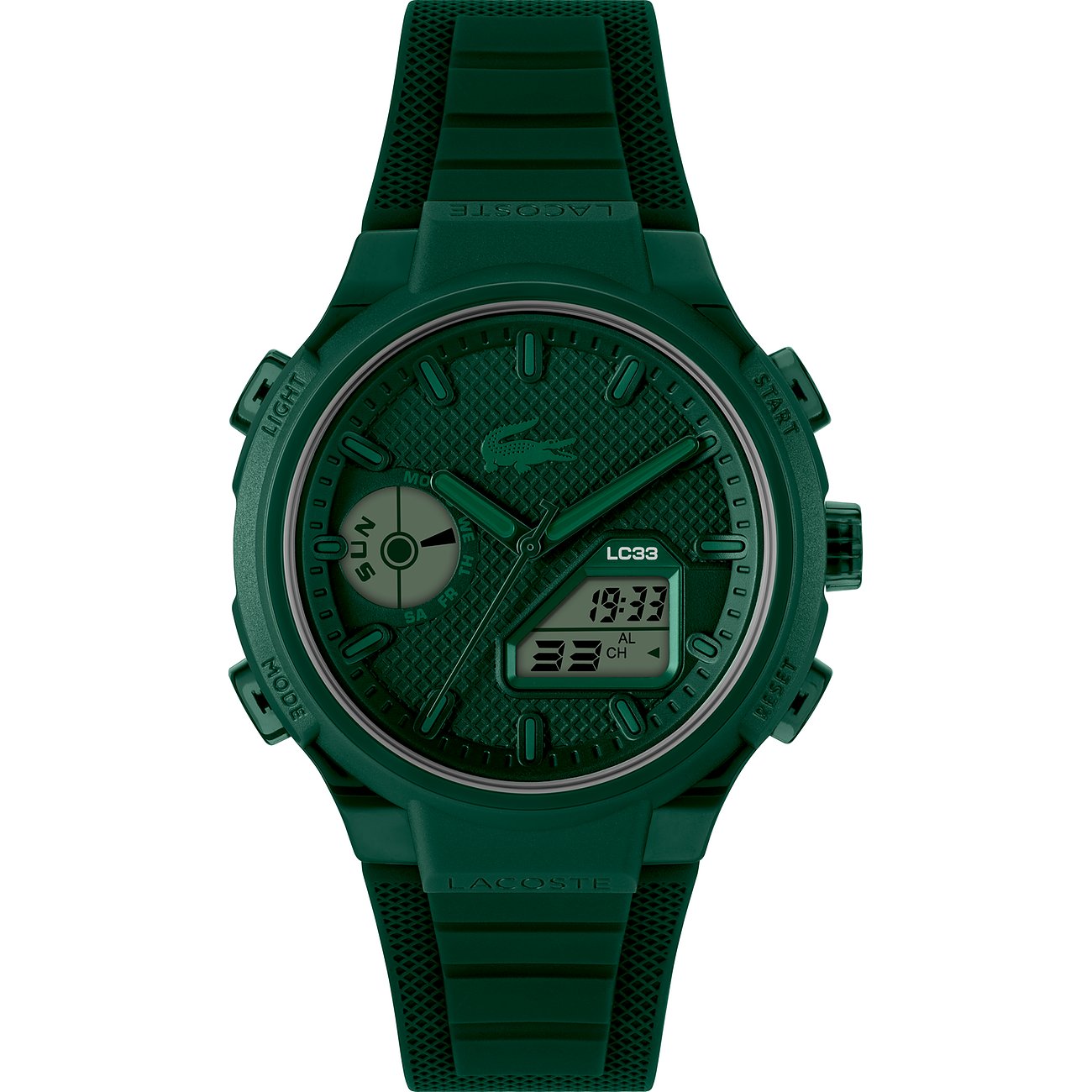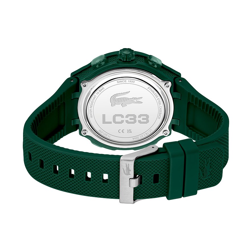 Lacoste Uhren stehen für zeitlose Coolness und frischen Style. Inspiriert vom sportlichen Erbe der Marke, passen sie ideal zu einem modernen, dynamischen Lebensstil. Perfekt für alle, die Eleganz mit einer lässigen Note kombinieren wollen. Die Lacoste Lc33 ist ein sportiver Chronograph für Herren, die bei Stil und Qualität keine Kompromisse machen wollen. Das Gehäuse aus Edelstahl mit Kunststoff und das Silikonband bieten einen sportlichen Look vom Office bis in die Freizeit. Das Grün von Ziffernblatt und Lünette sorgt in Kombination mit dem dunkelgrünen Gehäuse und Armband der Lacoste Lc33 für das gewisse Etwas.