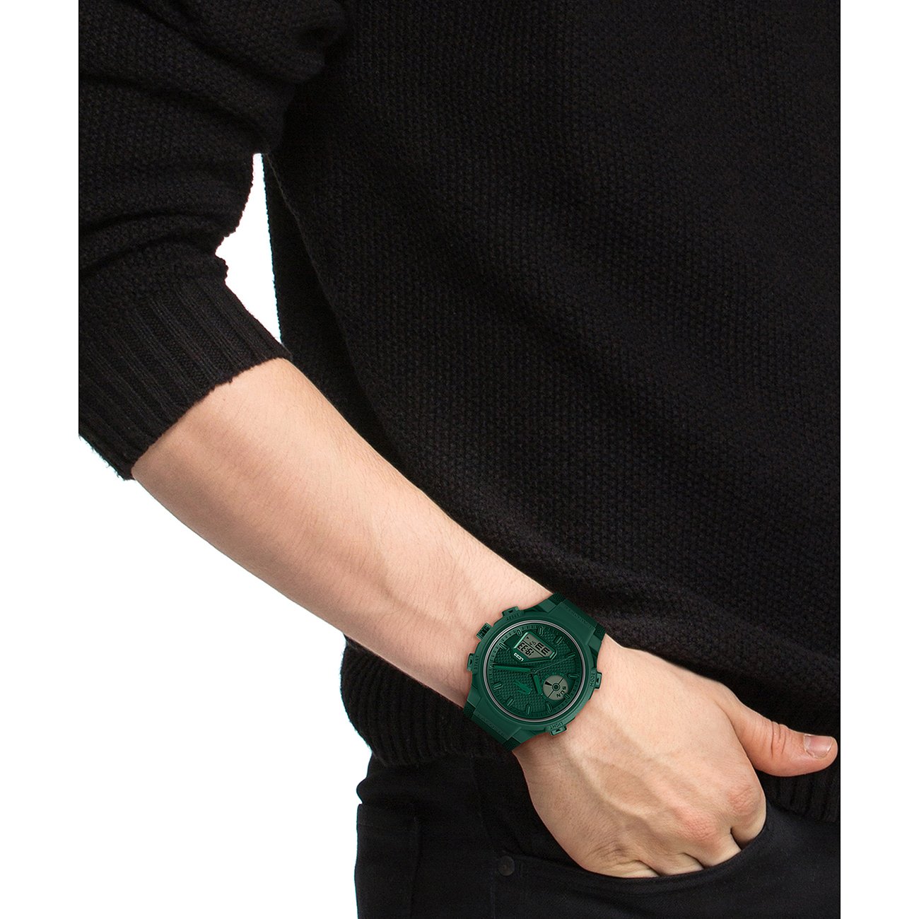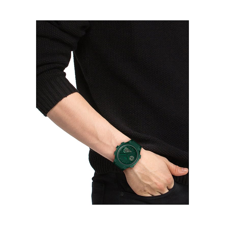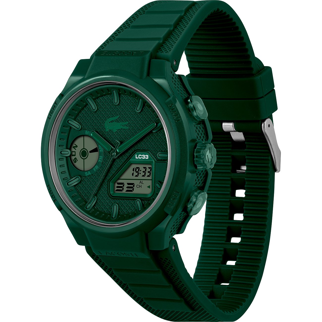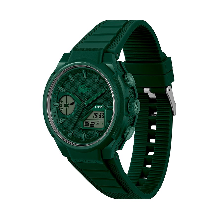 Lacoste Uhren stehen für zeitlose Coolness und frischen Style. Inspiriert vom sportlichen Erbe der Marke, passen sie ideal zu einem modernen, dynamischen Lebensstil. Perfekt für alle, die Eleganz mit einer lässigen Note kombinieren wollen. Die Lacoste Lc33 ist ein sportiver Chronograph für Herren, die bei Stil und Qualität keine Kompromisse machen wollen. Das Gehäuse aus Edelstahl mit Kunststoff und das Silikonband bieten einen sportlichen Look vom Office bis in die Freizeit. Das Grün von Ziffernblatt und Lünette sorgt in Kombination mit dem dunkelgrünen Gehäuse und Armband der Lacoste Lc33 für das gewisse Etwas.