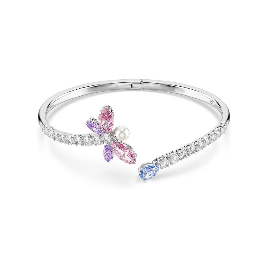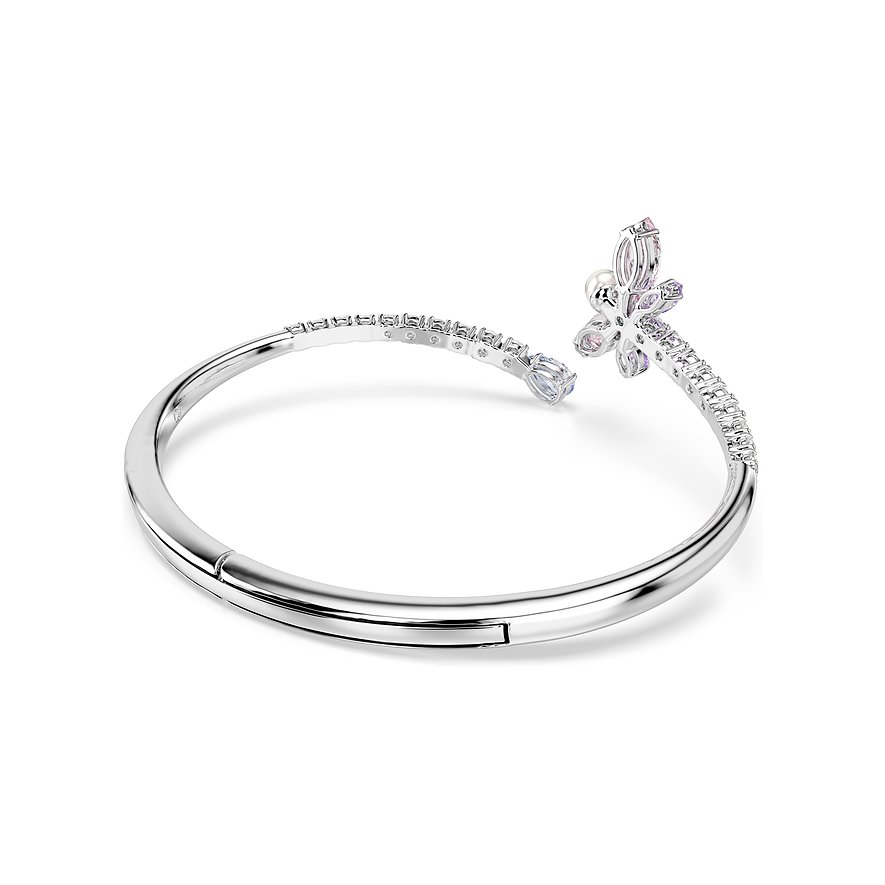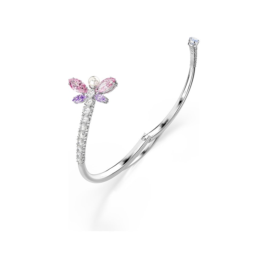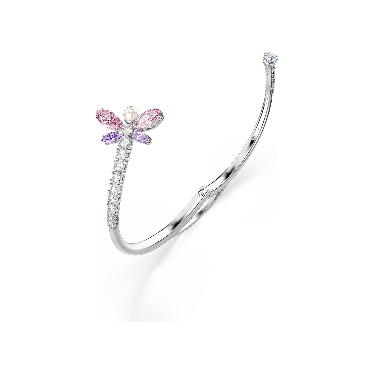 Dieses moderne Armband von Swarovski ist das perfekte Schmuckstück für Frauen, die außergewöhnliche Designs lieben. Aus rhodiniertem Metall gefertigt, glänzt der edle Armreif wunderschön. Das absolute Highlight ist das detailreiche Libellen-Motiv, das mit funkelnden Swarovski-Kristallen in zartem Rosa und leuchtendem Lila sowie einer schimmernden Perle verziert ist. Das asymmetrische Design mit der offenen Silhouette verleiht dir einen herrlich raffinierten Look. Die pavé-gefassten, klaren Kristalle entlang der geschwungenen Form fangen das Licht bei jeder Bewegung zauberhaft ein.
