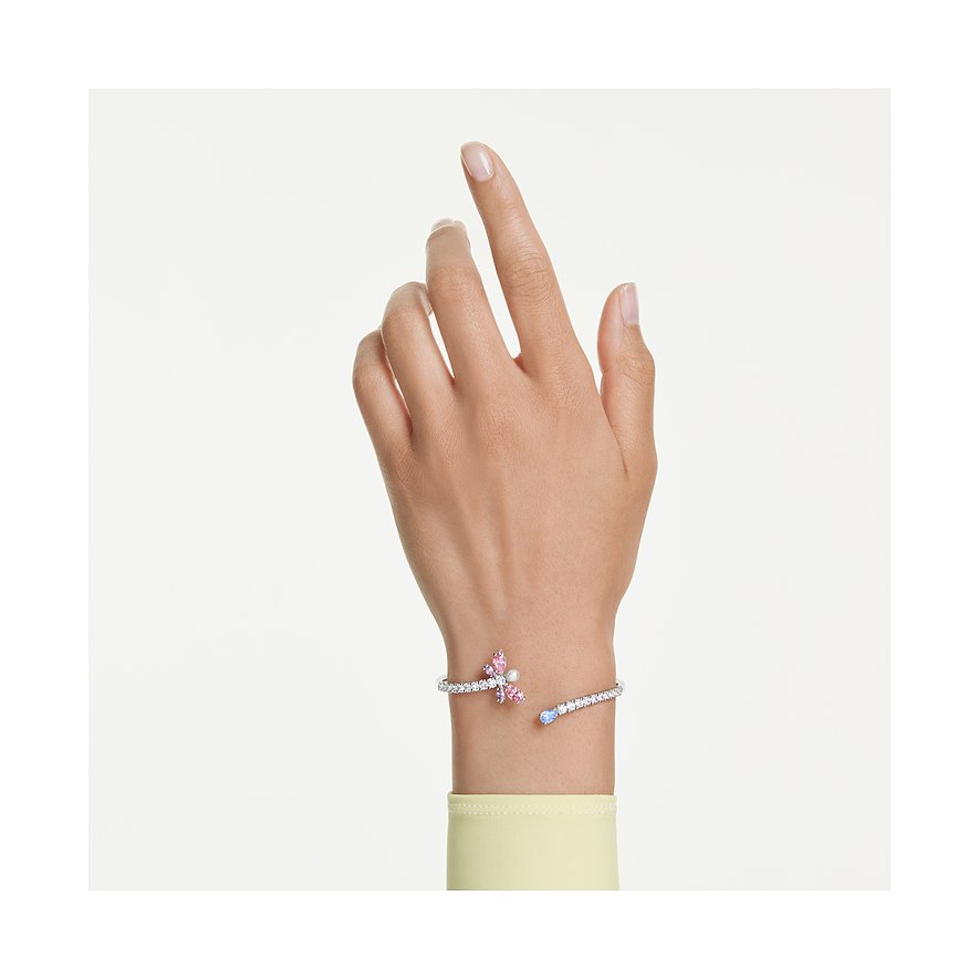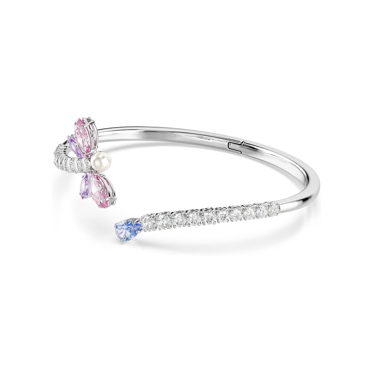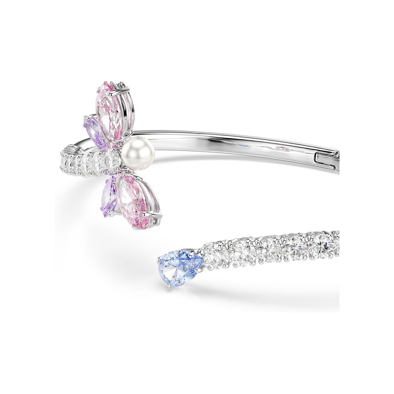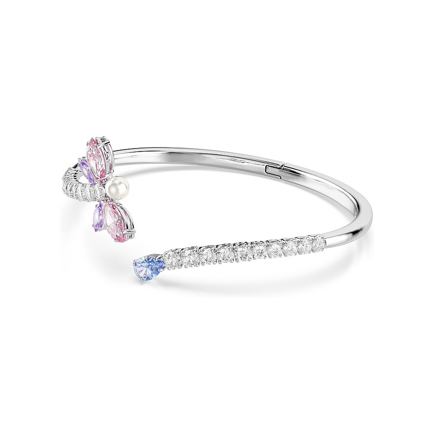 Dieses moderne Armband von Swarovski ist das perfekte Schmuckstück für Frauen, die außergewöhnliche Designs lieben. Aus rhodiniertem Metall gefertigt, glänzt der edle Armreif wunderschön. Das absolute Highlight ist das detailreiche Libellen-Motiv, das mit funkelnden Swarovski-Kristallen in zartem Rosa und leuchtendem Lila sowie einer schimmernden Perle verziert ist. Das asymmetrische Design mit der offenen Silhouette verleiht dir einen herrlich raffinierten Look. Die pavé-gefassten, klaren Kristalle entlang der geschwungenen Form fangen das Licht bei jeder Bewegung zauberhaft ein.