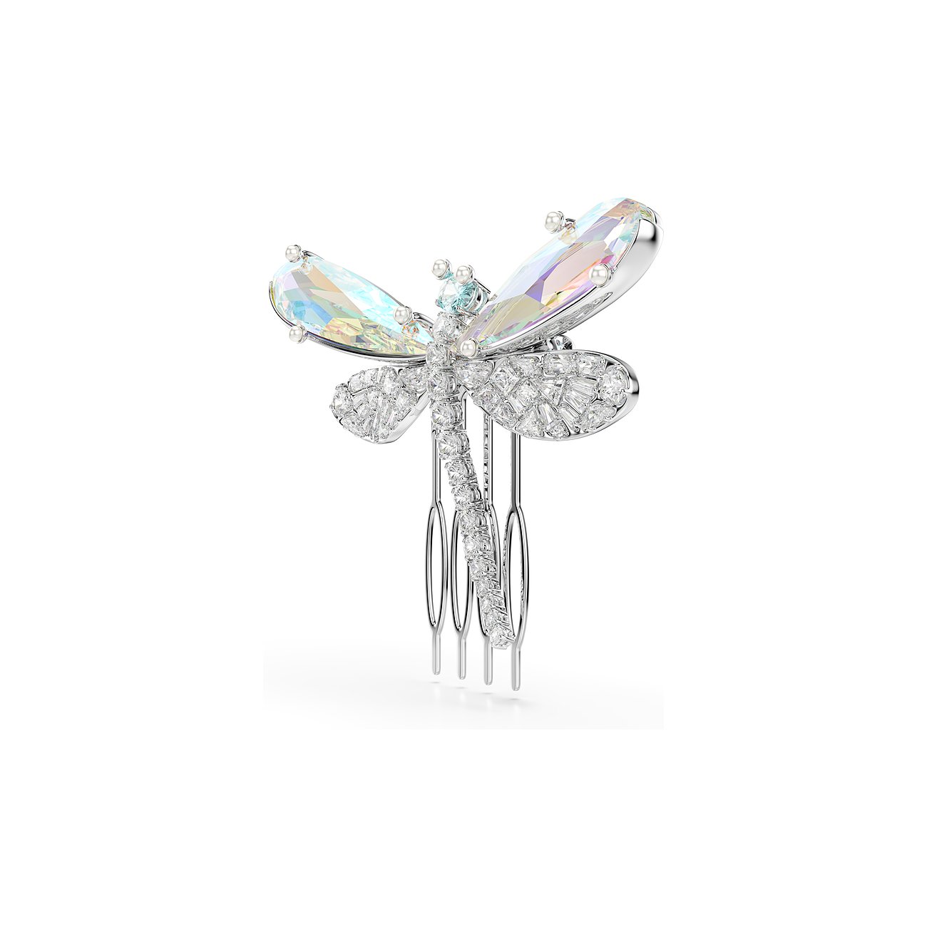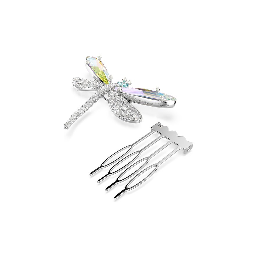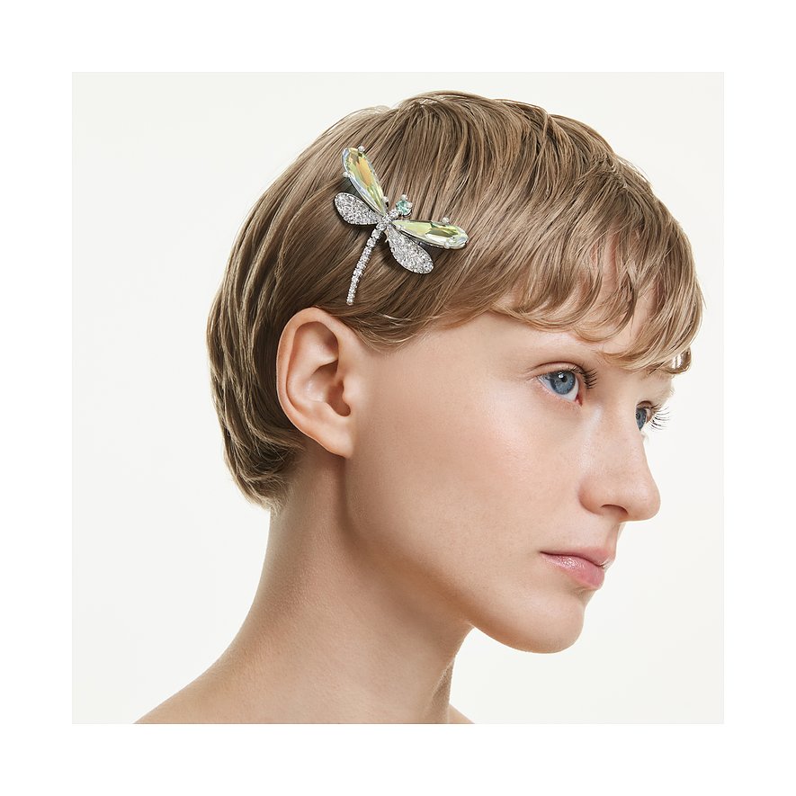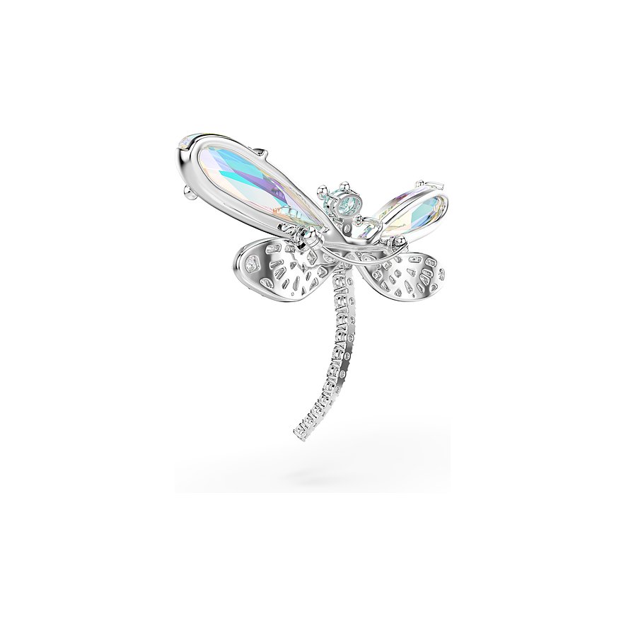 Entdecke dieses faszinierende Schmuckstück von Swarovski, das speziell für Damen kreiert wurde. Gefertigt aus rhodiniertem Metall in strahlendem Silber, besticht dieses meisterhafte Accessoire durch seine unglaubliche Vielseitigkeit. Die filigrane Libelle ist mit funkelnden Swarovski-Kristallen besetzt, wobei die großen oberen Flügel in faszinierenden, grünlich irisierenden Nuancen schimmern. Der detailreiche Körper und die unteren Flügel sind mit klaren Steinen verziert, die bei jedem Lichtstrahl ein wahres Feuerwerk an Reflexionen entfachen.